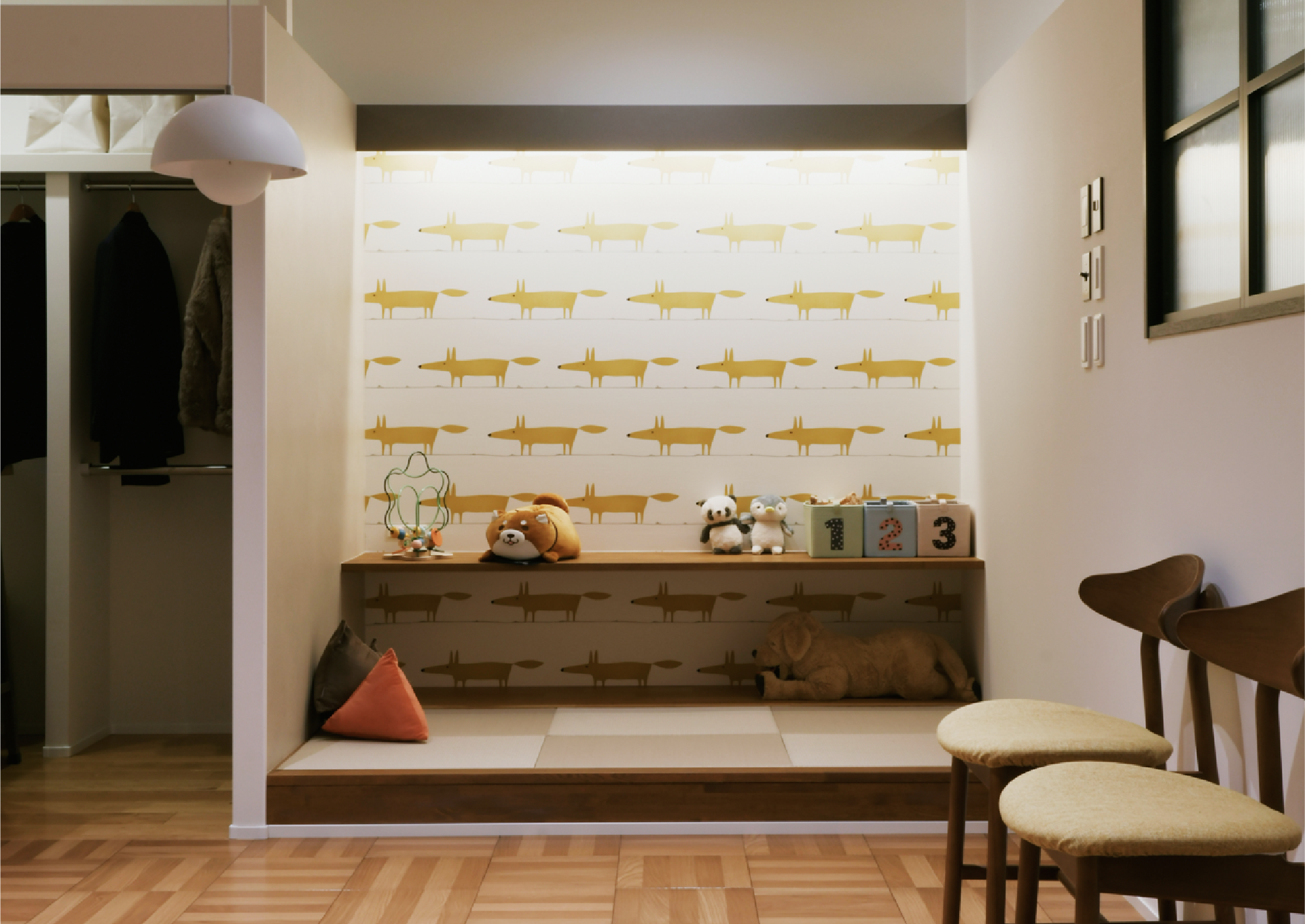 子供部屋を連想させる遊び心のあるアクティビティスペース。ポーターズペイントによる塗装面はチョークでお絵かきができるため創造力を刺激します。リビング学習が可能なカウンターを備え、床は汚れが落ちやすい樹脂畳という構成。