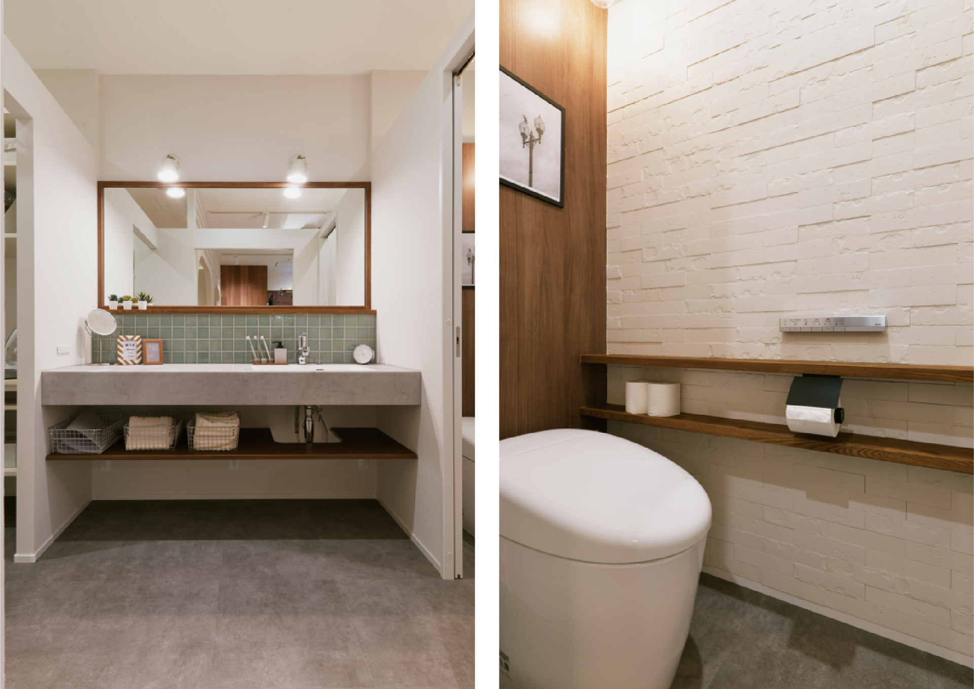 幅広の1.65mの洗面スペースは、忙しい朝の身支度を快適にします。アイカの造作風洗面台「スマートサニタリー」は、シンプルで洗練されたデザインです。タンクレストイレにはTOTOネオレストを採用し、木目のクロスとエコカラットの壁面が高いデザイン性を演出します。