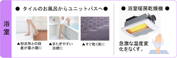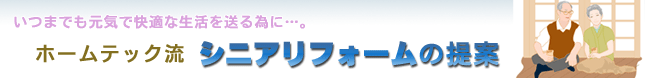 | 元気な50歳以上の方が、これからも介護を受けることなく、 元気に楽しく暮らしていくためのバリアフリーリフォームのこと。 介護が必要になってからのリフォームではなく、 介護を予防する為のものです。 シニアリフォームの普及により要介護者の増加を抑えましょう。 |