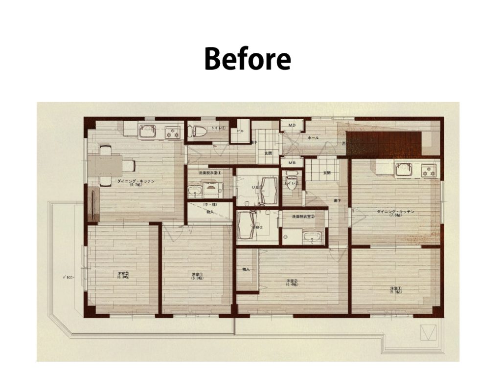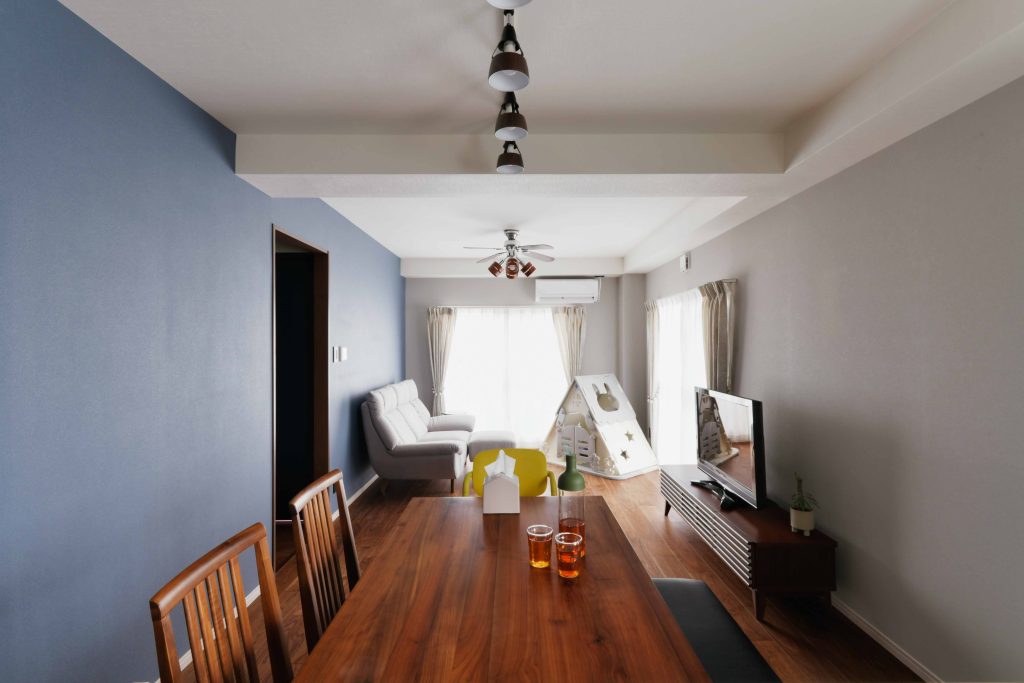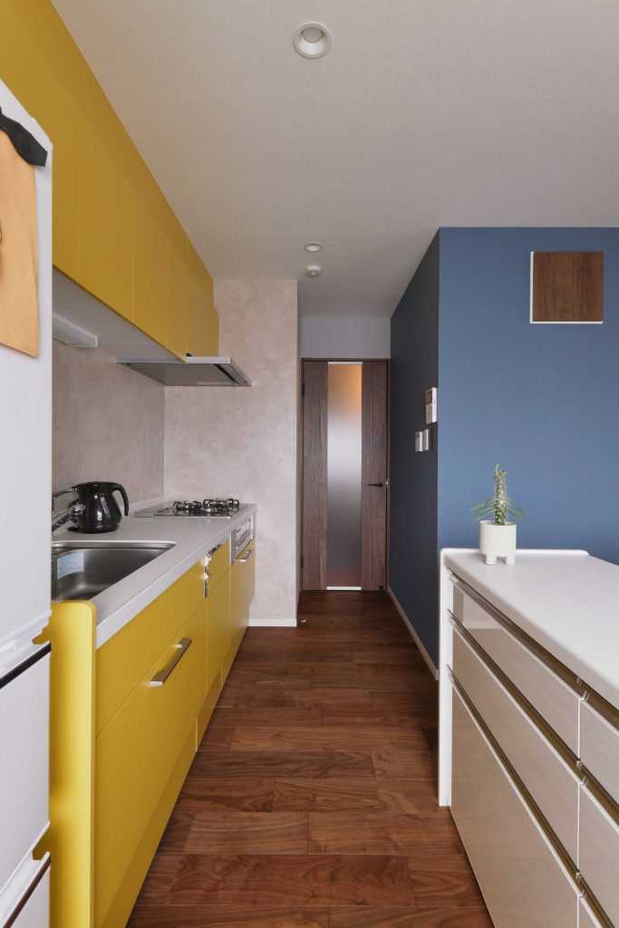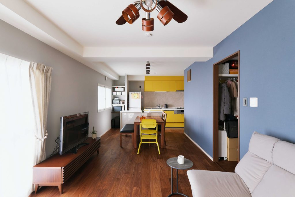 キッチンは対面化させようと悩みましたが、どうしてもリビングの空間を狭めてしまうため、あえて壁付けにすることで広々とした空間を確保。洋室2つのうち一つをリビングに取り込み、使いずらかった押し入れの収納は分散させることで、使い勝手が良くなりました。