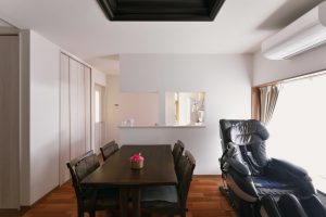 二世帯住宅が世代交代し、今度はお母様と娘様ご家族が同居される二世帯住宅に生まれ変わりました。今まで1階と2階の両方にあったキッチンは1階のみにして、ご家族全員が集まるLDKとなりました。独立型のキッチンから対面キッチンをご希望されましたが、吊戸棚は必要で構造上取れない柱もあったので、適度に壁面もあるキッチンとなりました。