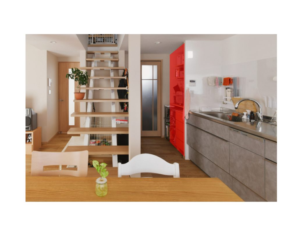 階段の位置との兼ね合いで、キッチンは壁付けにしました。