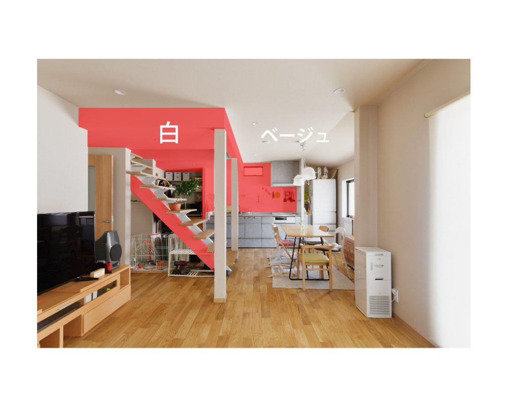 階段が印象的な明るいリビングは天井や壁に「白」と「ベージュ」をうまく合わせて、空間をコーディネートしています。