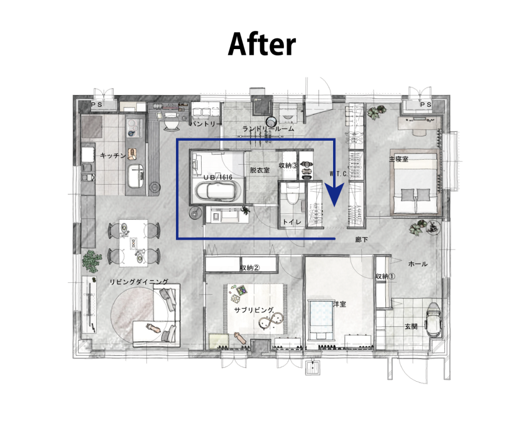 家の中心をぐるっと回ることができる回遊動線になったことで、家事がしやすくなりました。
