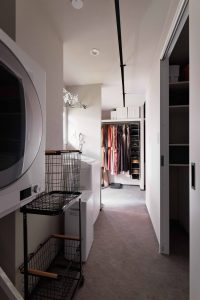 回遊動線を意識するとただ通るだけの無駄なスペースができてしまうデメリットの改善策として、キッチン前のスペースに在宅ワークができるスペースと収納スペースを兼ねたカウンターを設置、廊下にオープンに洗面化粧台を設置、などの工夫をし、できる限り無駄なスペースができないようにした。