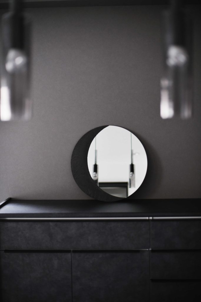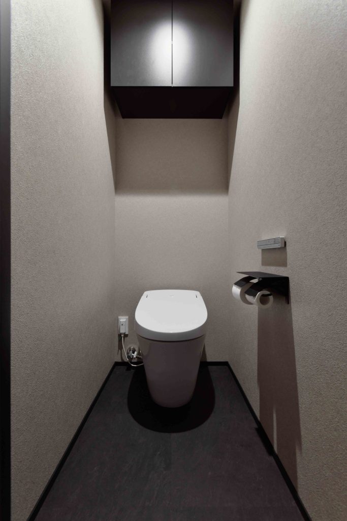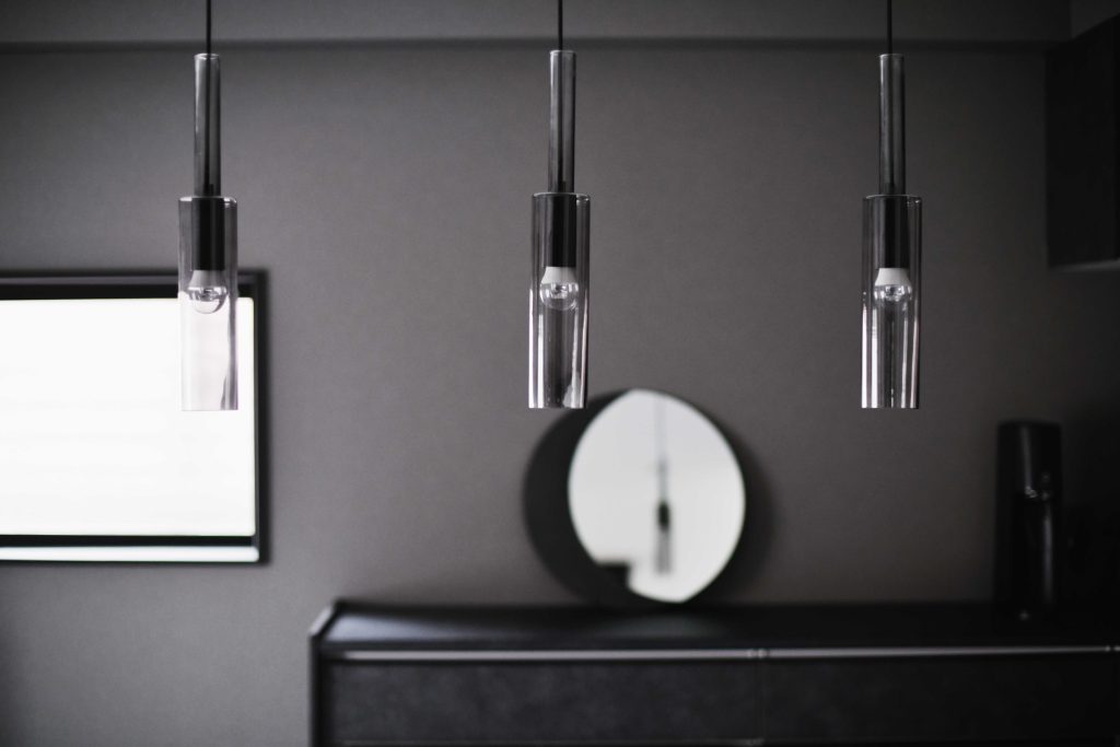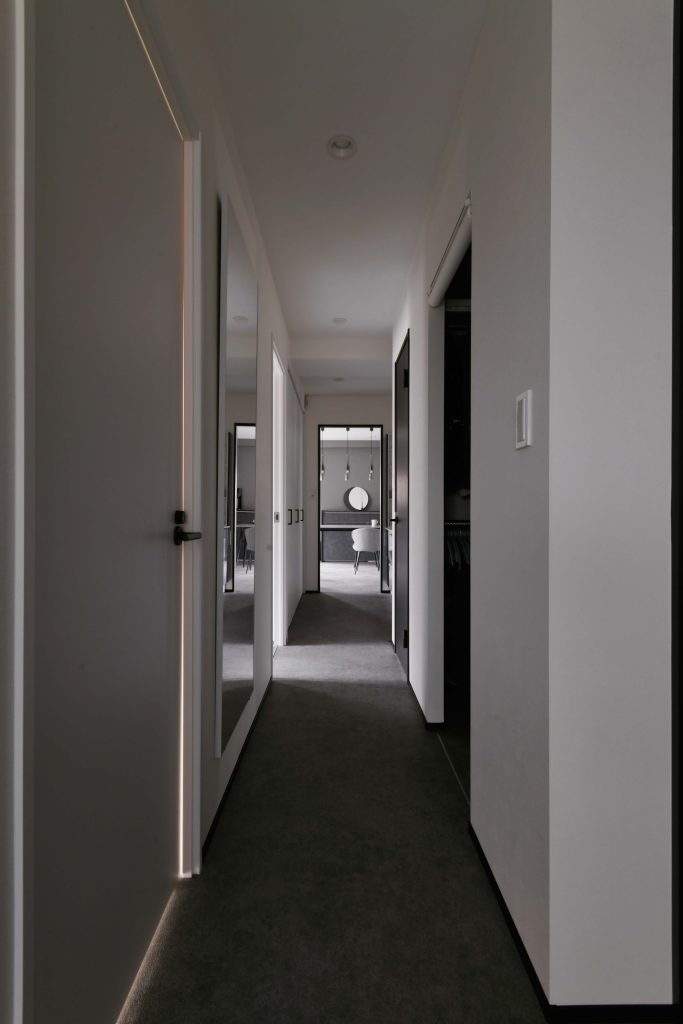 モノトーンのインテリアの空間が上手くまとまるよう、ホワイト・グレー・ブラックのカラーバランスを工夫。シャープな印象を出すため、シンプルなライン(線)を意識した。