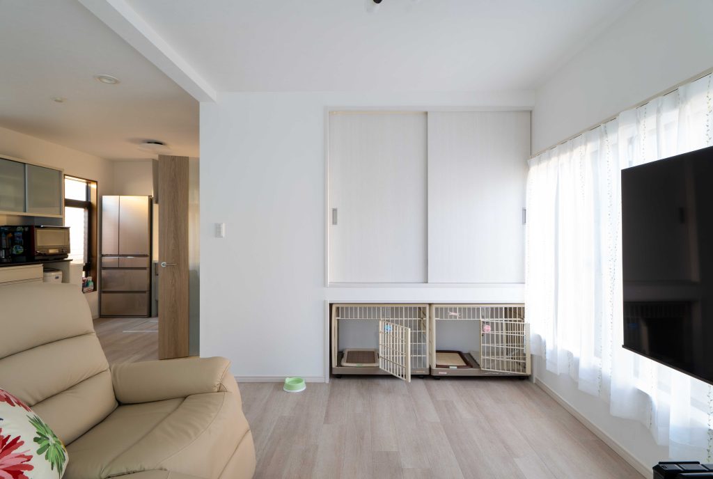 和室をリビングに取り込んで、広々としたLDK空間になりました。床は壊さずに重ねて張るなど、コストバランスも考えたリフォームです。わんちゃん達が快適に過ごせるペットホテルのような元押入れ空間の使い方ができました。