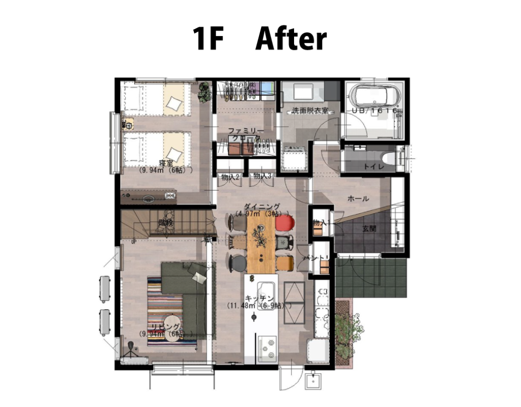 1階はリビング、寝室、WIC、洗面脱衣室の回遊式で家事動線もよくなった。