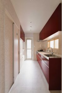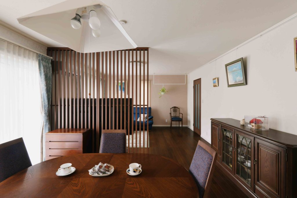 当初はキッチンをリビング側に移す計画もしておりましたが、打ち合わせを重ね、リビングを広く使いたいということでキッチンは移設せずに気に入っているフローリングを残し収納を増やしました。また、リビングとダイニングの間に間仕切り格子を建てることによって程よいつながり、ほどよい目隠しになりました。