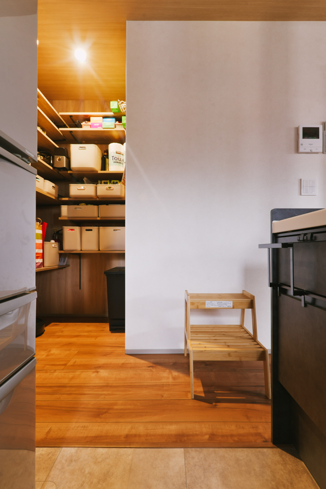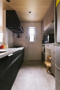 キッチンとカップボードの面材を揃えなければいけないルールはありません。キッチン側は黒の扉柄、カップボード側は木目の柄で組み合わせをしています。