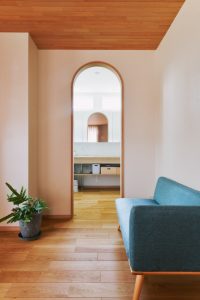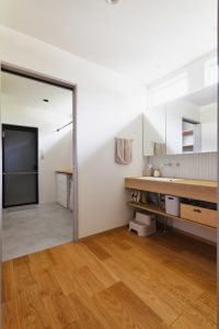 リビングダイニングから洗面〜浴室へ直接アクセスできる間取りに変更。