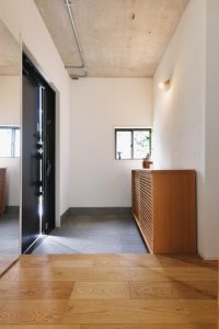 玄関の上がりの向きを変えることで、収納を一箇所に集約。アトリエの入り口の無垢の建具も玄関空間をおしゃれに彩る要素となりました。