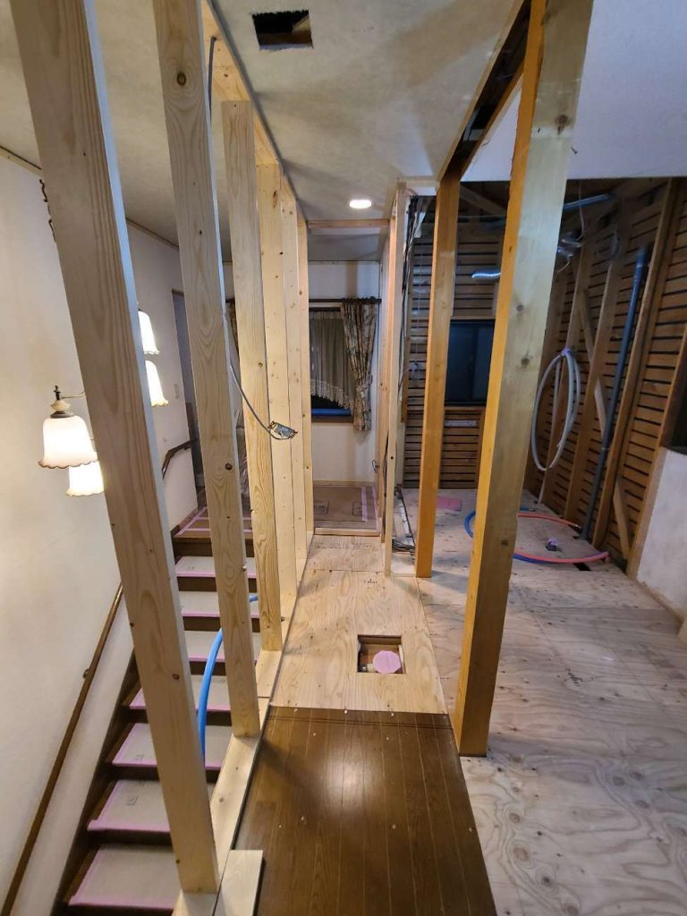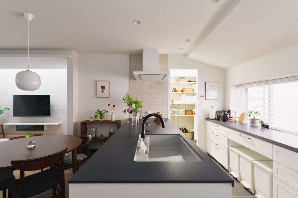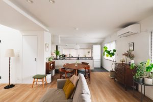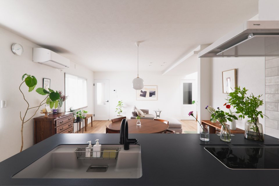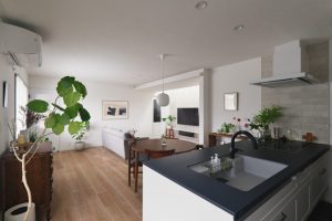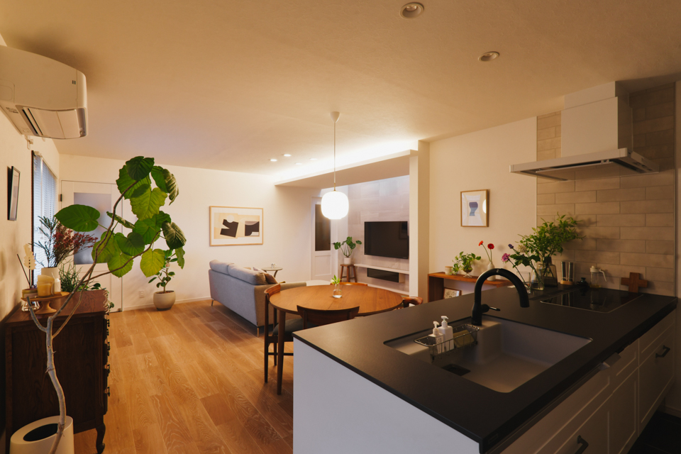 対面キッチンと開放的なリビングを実現するために、廊下をリビングに取り込む形で間取りの変更を行いました。