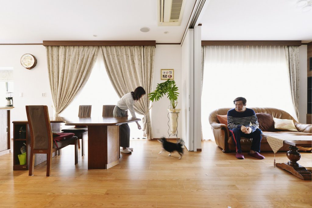 ご両親の介護が一段落し、これから終の住処として良い家にしたいという思いをきっかけにお声掛け頂きました。荷物置きとなってしまっている和室スペースを有効に使えるようにすること、ご主人様の仕事で打合せスペースとして使える応接室があること、明るく開放的なキッチンにすること、暖かくて心地の良いリビングにすること、などを主なご要望として、最初にお話しを頂いておりました。