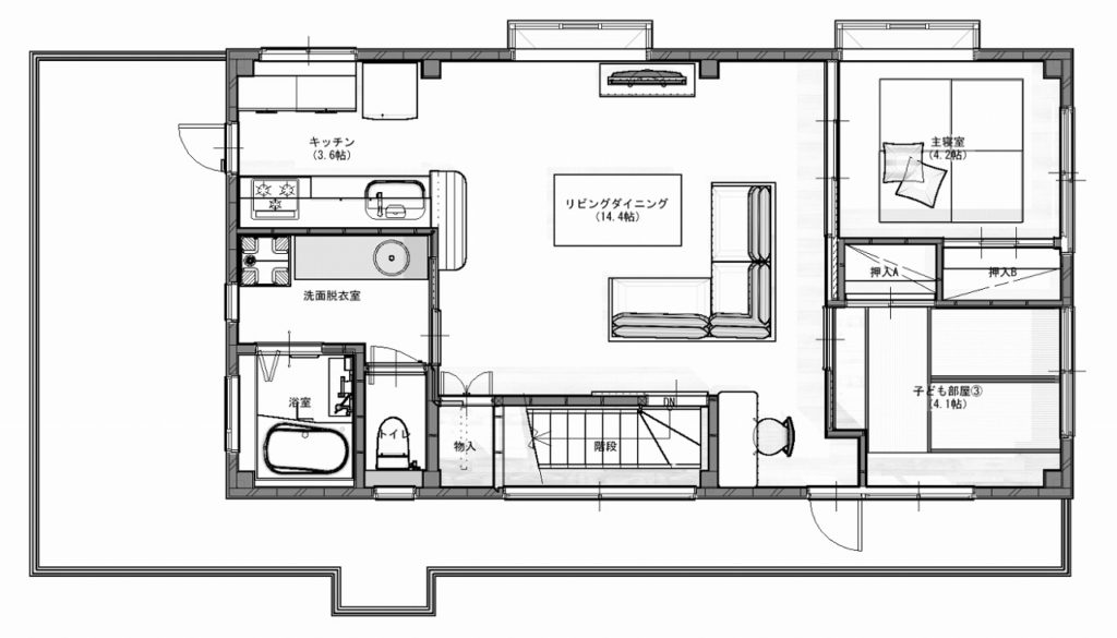 リビングに向かってキッチンを配置しようとすると、キッチンが小さくなってしまったり、洗面所が狭くなってしまうため、あきらめていらっしゃったのですが、対面という形にこだわらずに、本来の目的であるリビングとのつながりを作ることで、キッチンの大きさも洗面所の広さも、実現することができました。リビングは広いだけではなく、四方から日の光が差し込む明るい空間となりました。