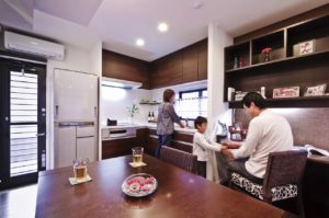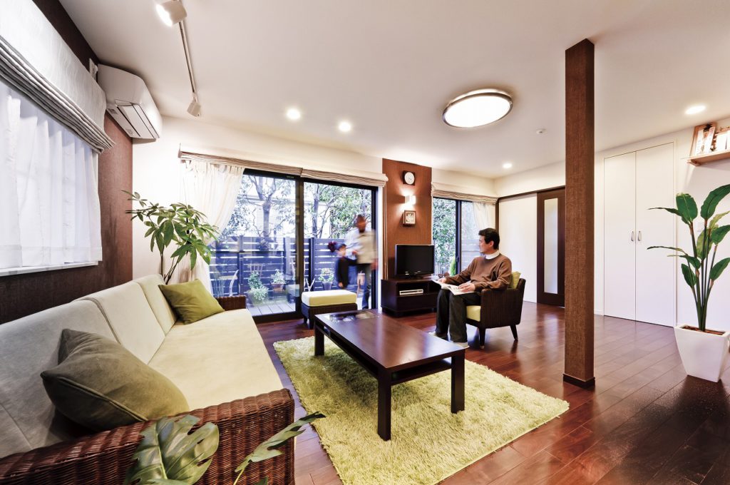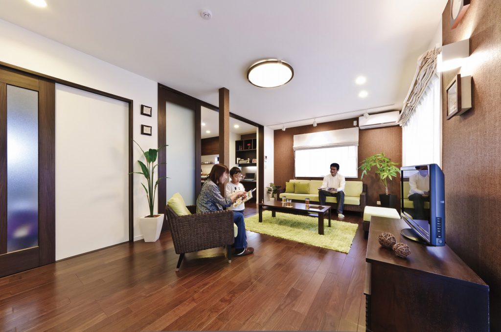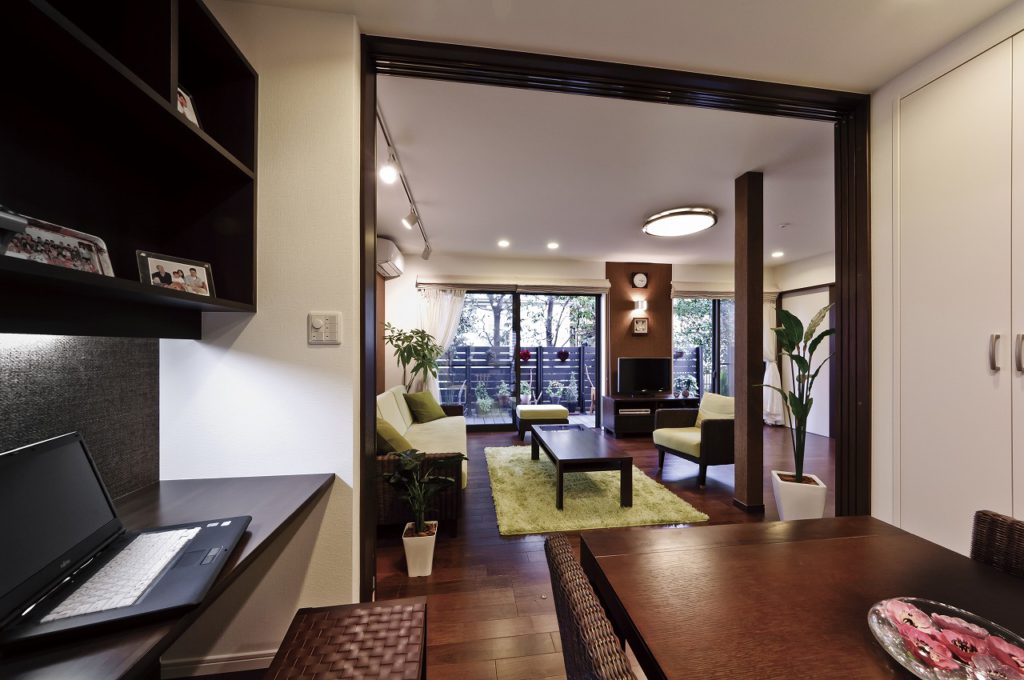 子世帯はダークブラウンの床材やクロスを活かしたアジアンテイストに、親世帯は白を基調にした明るい空間に仕上げています。