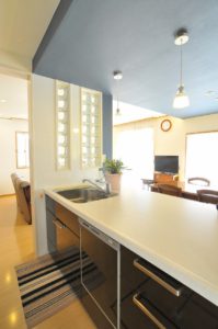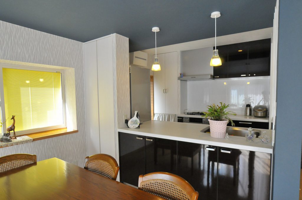 キッチンの天井を下げ、間接照明を取り込むことでしっとりとした落ち着いたデザインになり、リビングダイニングとの調和の持てる空間となりました。