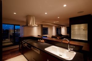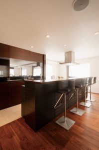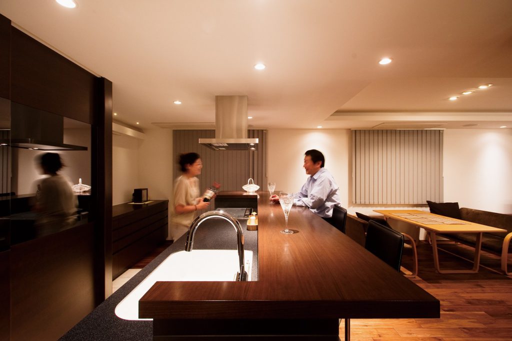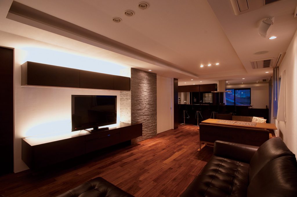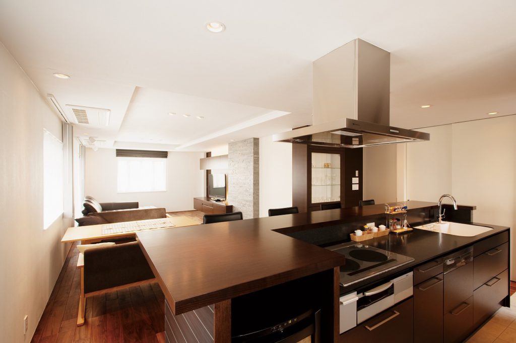 Y様の職場は白を基調とした空間。そこで、キッチンの面材やオーダーメイドのテレビボードは対照的なダークブラウンを配し、仕事場とは異なるシックなデザインを提案しました。