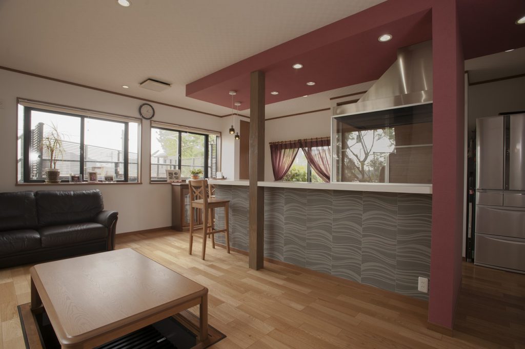 構造的に抜けない柱は木目調の化粧柱とし、空間のアクセントに仕上げました。食器棚と家電収納は天井までの扉を取り付け、閉めてしまえばすっきりとしたお部屋のイメージを保てます。