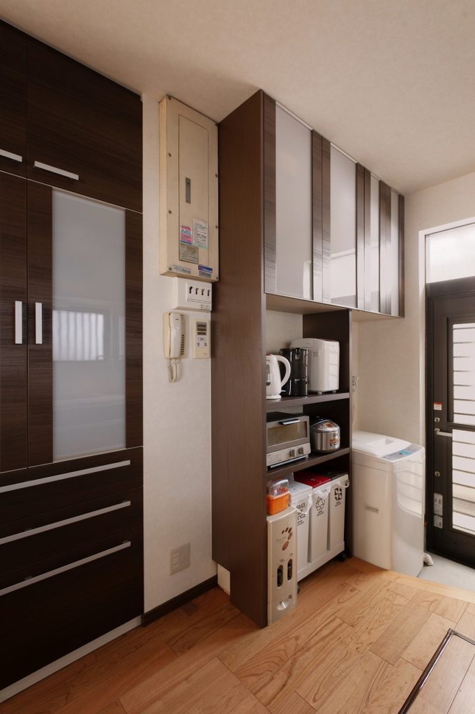収納は既製品と造作家具を組み合わせお手持ちの家電製品などがぴったり納まるよう設計いたしました。