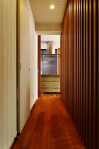 実際には格子で仕切られた壁がありますが、アクリルパネルを通して廊下もリビングに取り入れられる視覚効果があります。