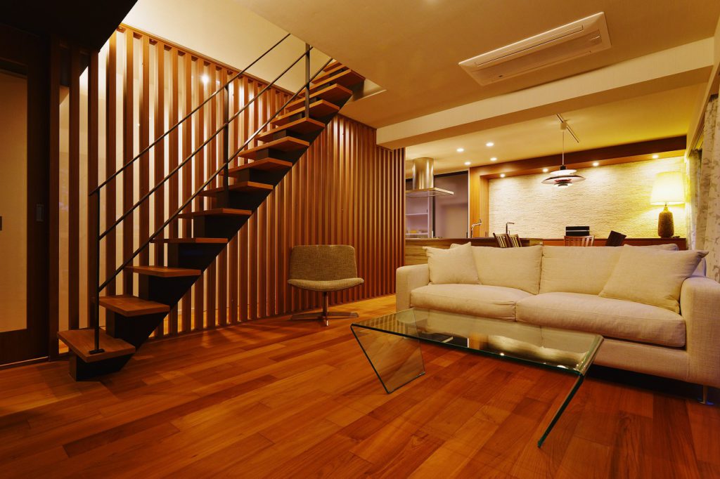 床にはチーク材、建具は桐のデザインパネル、ベランダにはウッドデッキを敷き込みリビングと一体化しました。