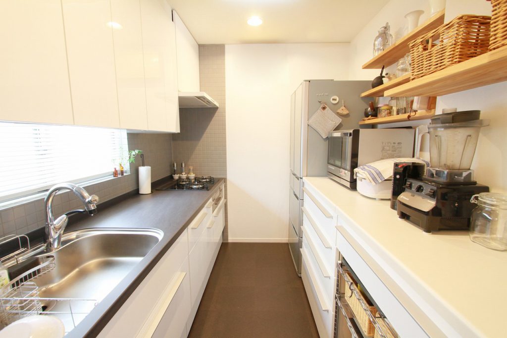 海外のキッチンのように男らしくかっこいいキッチンをご希望されていて、LIXILのリシェルのセラミック天板とキッチン廻りの壁にはタイル施工のご提案をしました。お客様と打ち合わせを進めていく中で、床はコルクタイル、壁には無垢のカウンターを設置することになりました。無機質な空間の中にナチュラルな棚が映えます。