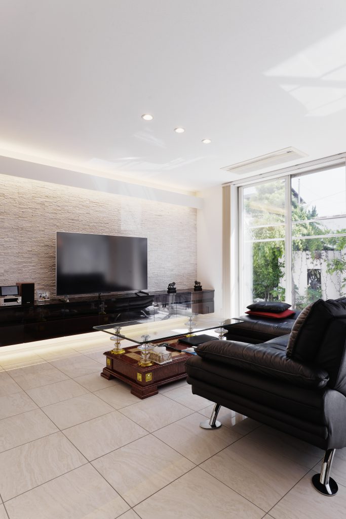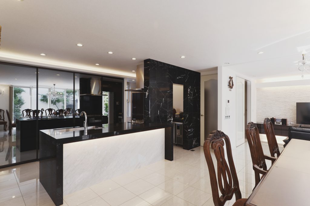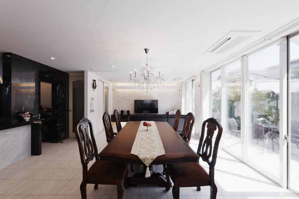 とにかく広いリビングと、高級感のあるインテリアがご希望でした。テラスでのバーベキューも楽しめるように、中と外のつながりのある空間も重要ポイントでした。