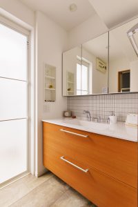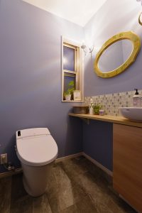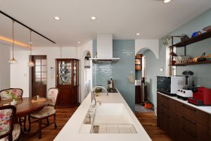 アクセントタイルやクロスの一部に使用したブルーと、床や家具の木目のコントラストが美しい仕上がりになりました。