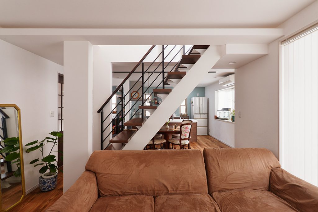 2Fは、3Fへ続く階段を挟んでダイニングと洋室がそれぞれ独立していましたが、階段をスケルトンにし、ダイニングと洋室を繋げることで広々としたLDKを実現しました。