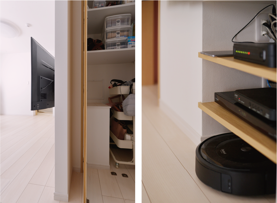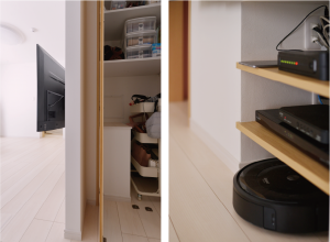 掃除のしやすさの工夫:ルンバのお家/引戸を全て上吊りにしてレールを付けていない/収納内部に掃除機充電用コンセントを付けている