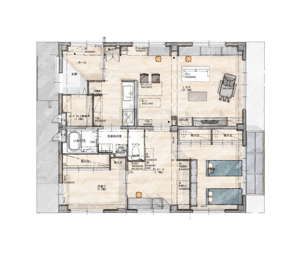 PLAN図の中にナンバ-リングし家具配置を書き入れ、引き戸(有効寸法)、家具と通路寸法などを書き入れたりと、御希望を反映の見える化をした資料とご説明をさせて頂いたことは、ご信頼をえられたひとつの要因かと思います。