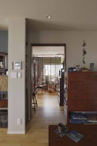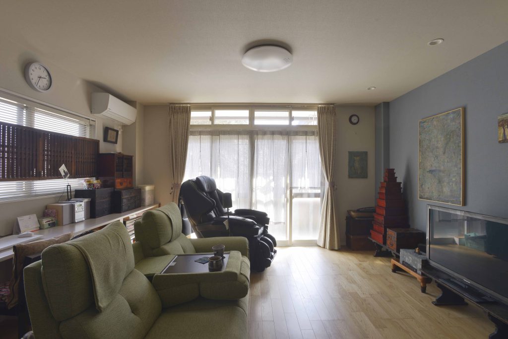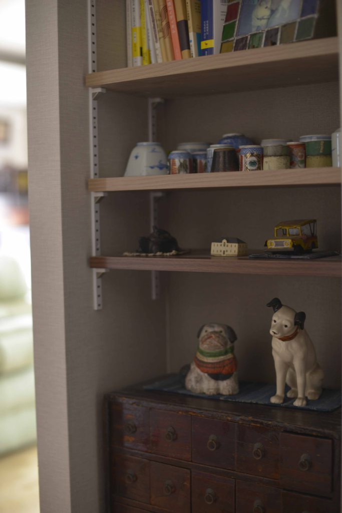 また、3階に住んでいた時の家具レイアウトのこだわりもお聞きし慣れ親しんだ使い勝手は活かしつつ、くつろげる部屋作りとしました。家具以外にも、味わいのある古道具や布、小物、食器も多かったので、鉄骨柱の凸凹を活かし、飾りスペ-スにしたりとご夫婦が集めてきた小物りなどを飾ってもらい楽しんでいただける家づくりにも注力しました。