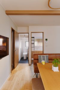 デザイン面:耐震上取れなかった梁と柱は木目のクロスを貼ってお部屋のワンポイントに
