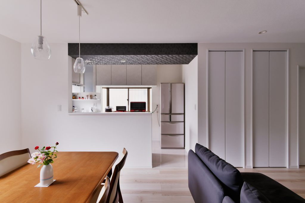 柱を抜き、梁で補強をする際にあえて梁部分の天井を下げてアクセントクロスを貼ることで意匠性を高めています。