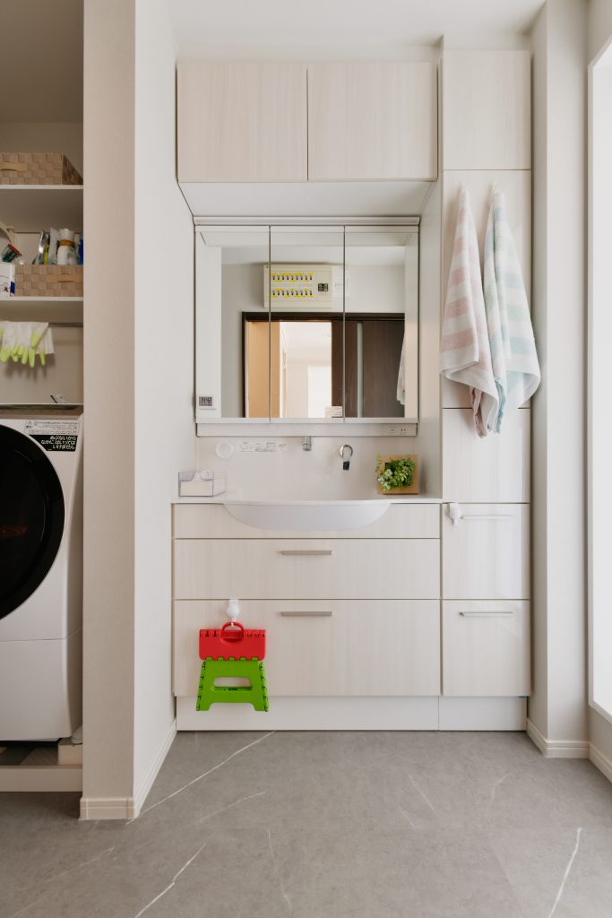 お孫さんと一緒に快適にお風呂に入りたいというご要望を聞き、動かせる壁に制約がありながらも洗面脱衣室を広くしながらお風呂も広くしたところがポイントです。