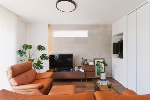 明るくて、居心地の良いリビング。ひとつひとつこだわって選んだものに囲まれて、とても素敵な空間になりました。玄関正面のスリットガラスや無垢天板を取り寄せて造ったダイニングテーブルなど、魅せどころ満載です。