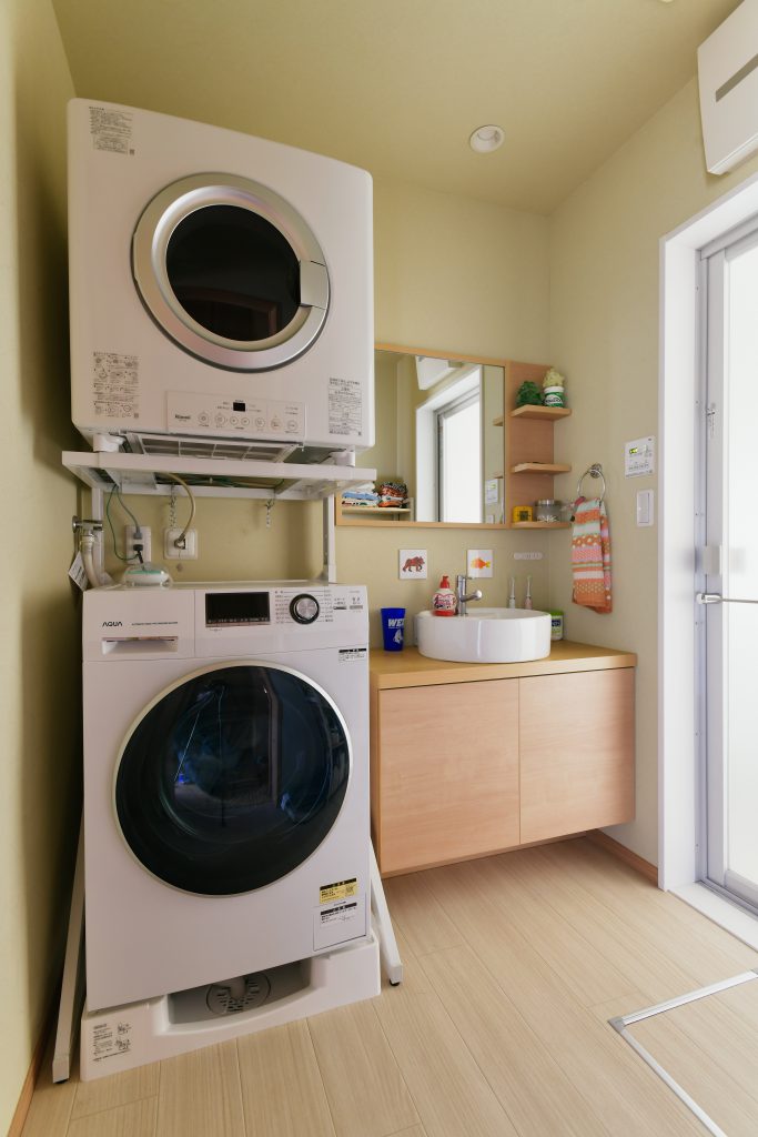 脱衣室、洗濯置き場:お風呂の位置をキッチン側に移動することで、脱衣スペースを広く確保できた