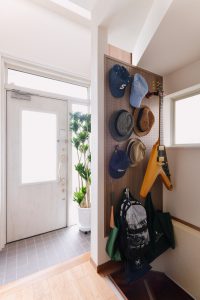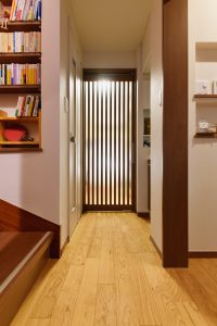 玄関入って正面、ご主人様のお部屋への入口の扉はこだわって選びました。スリットデザインの素敵な建具です。