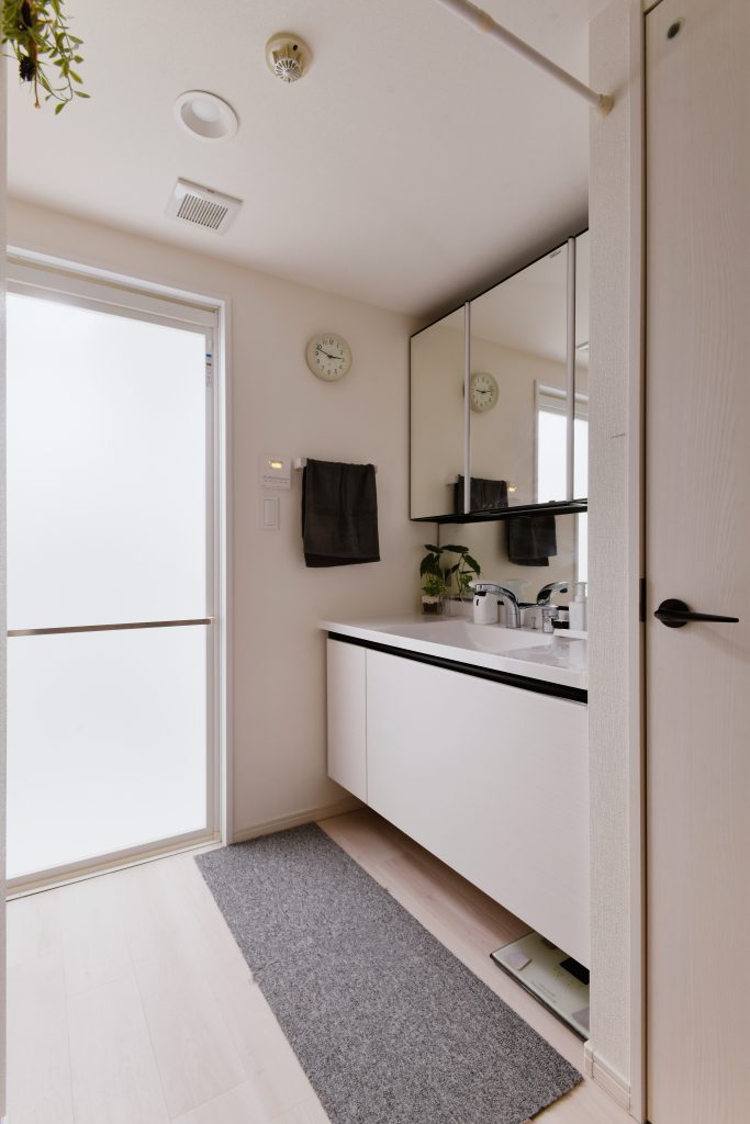 廊下を洗面室に取り込むことで、広さを確保し、キッチンから直接アクセスできるように間取りを変更しました。