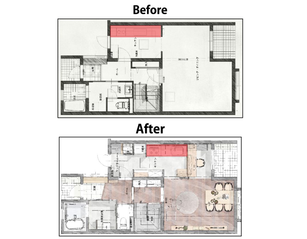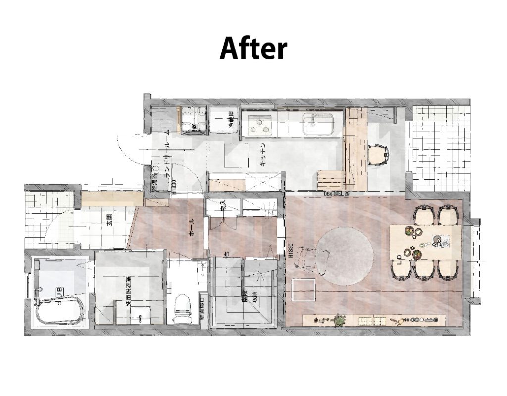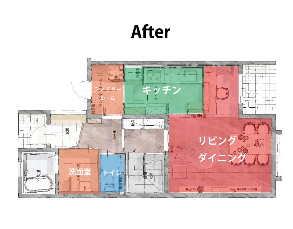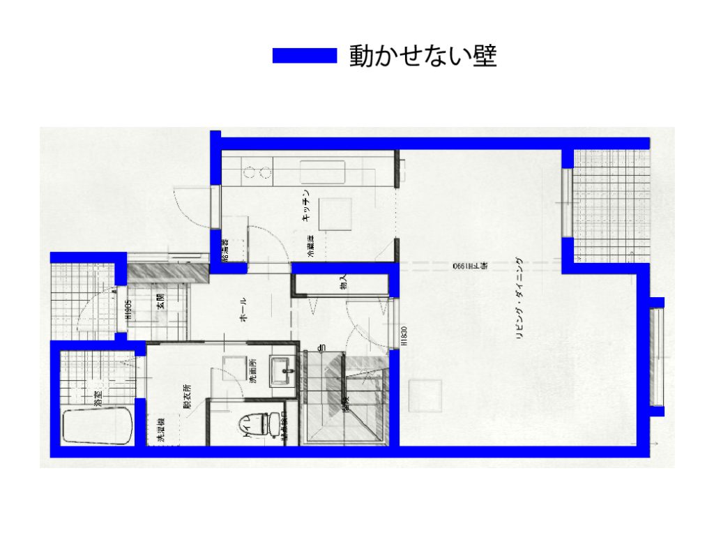 動かせない壁を考慮しながら、全体のゾーニング(リビングはこのエリア、洗面の空間はここで・・といった間取りのバランス)をし直しました。
