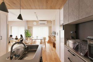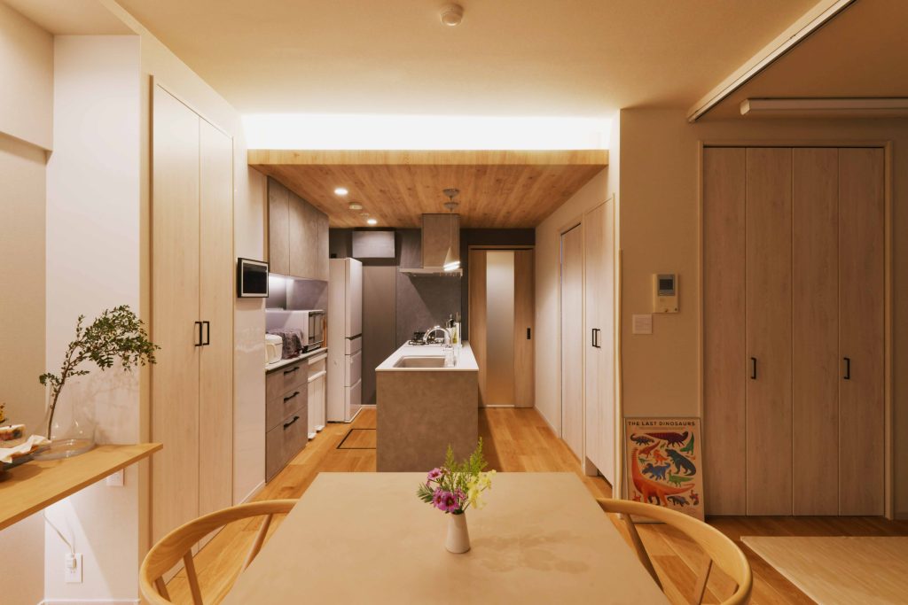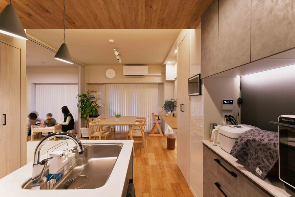 ダイニングとキッチンの間に取り付けたモニターは実はアレクサのモニター。配線は真後ろから隣の収納につながっていてすっきりさせています。その他収納各所にも工夫をして見た目だけでなく生活のしやすさもこだわりました。