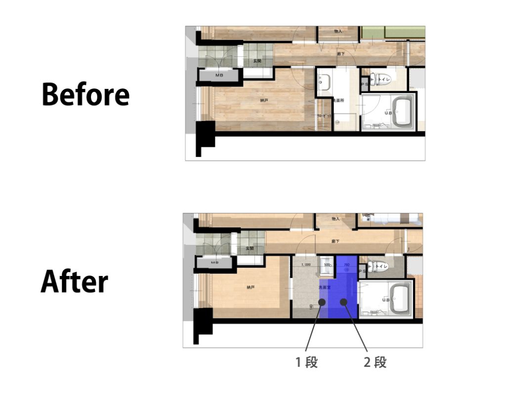 洗面室の入口の位置を見直し、洗面室内で段差を2段つける方法を取りました。