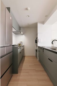 2列型のキッチンを採用するにあたってこだわったことは作業スペースが向い合せになるように設計したことでした。シンクで洗った食材を切って、くるっと振り向いてフライパンへといった動作にストレスが無いように配慮しています。