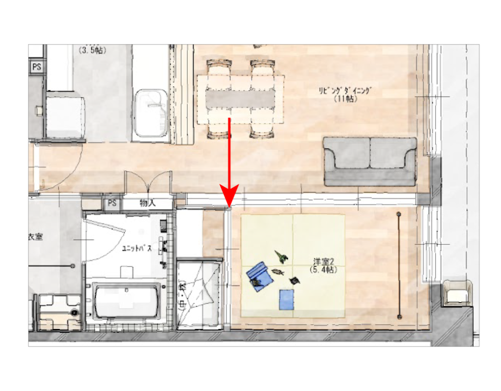 ダイニングスペースのクローゼットの空間と、間仕切り引戸を引き込んだ状態で、綺麗に面が揃うように、建具を取り付けています。細かなポイントです。
