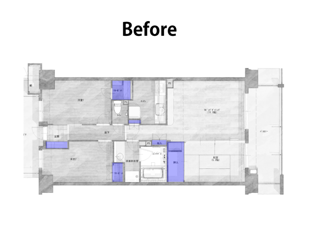 元の間取りは収納が少なく、4人家族で住まうためには収納を増やす必要がありました。