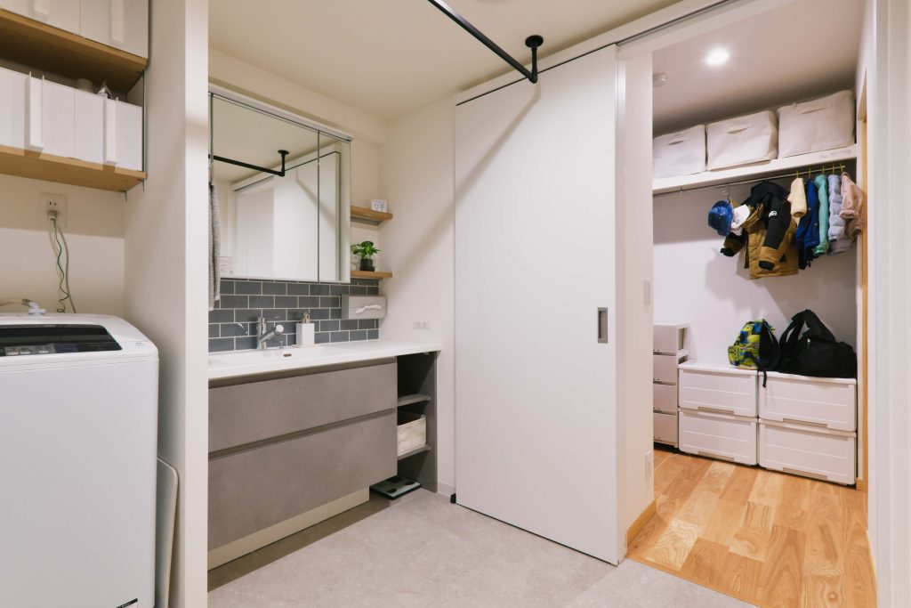 玄関横の洋室を土間続きのSICにすることで。玄関〜クローゼットを通り、洗面室へ。手を洗ってリビングへ。といったお帰り動線が生まれました。