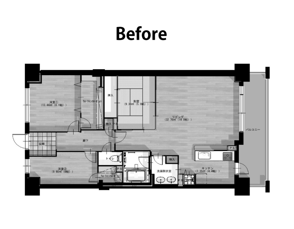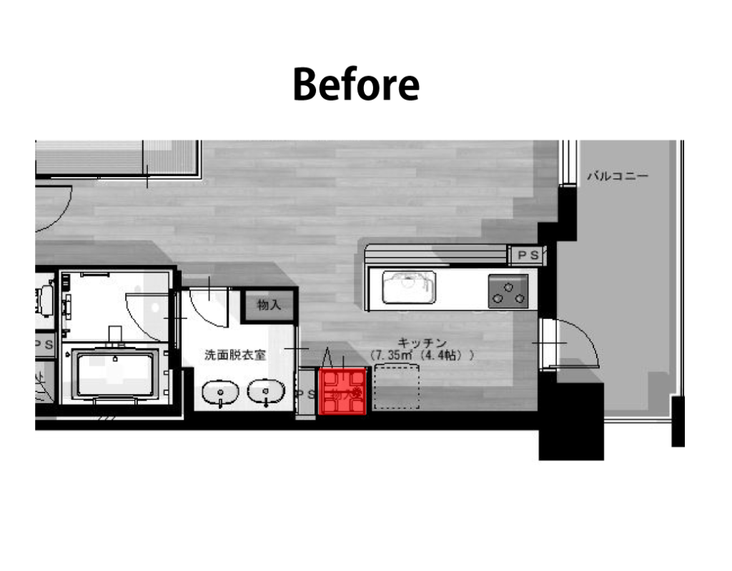 洗濯機を洗面室へ移動し、洗濯機があったスペースには冷蔵庫を置けるように設計しています。