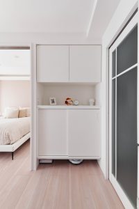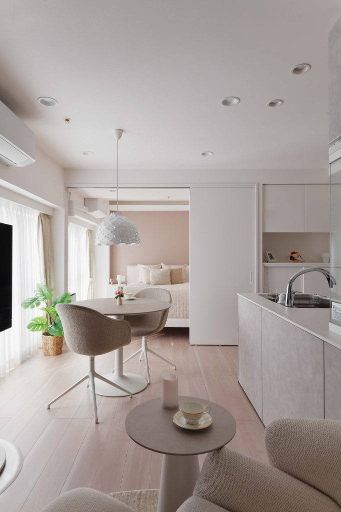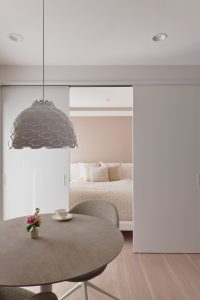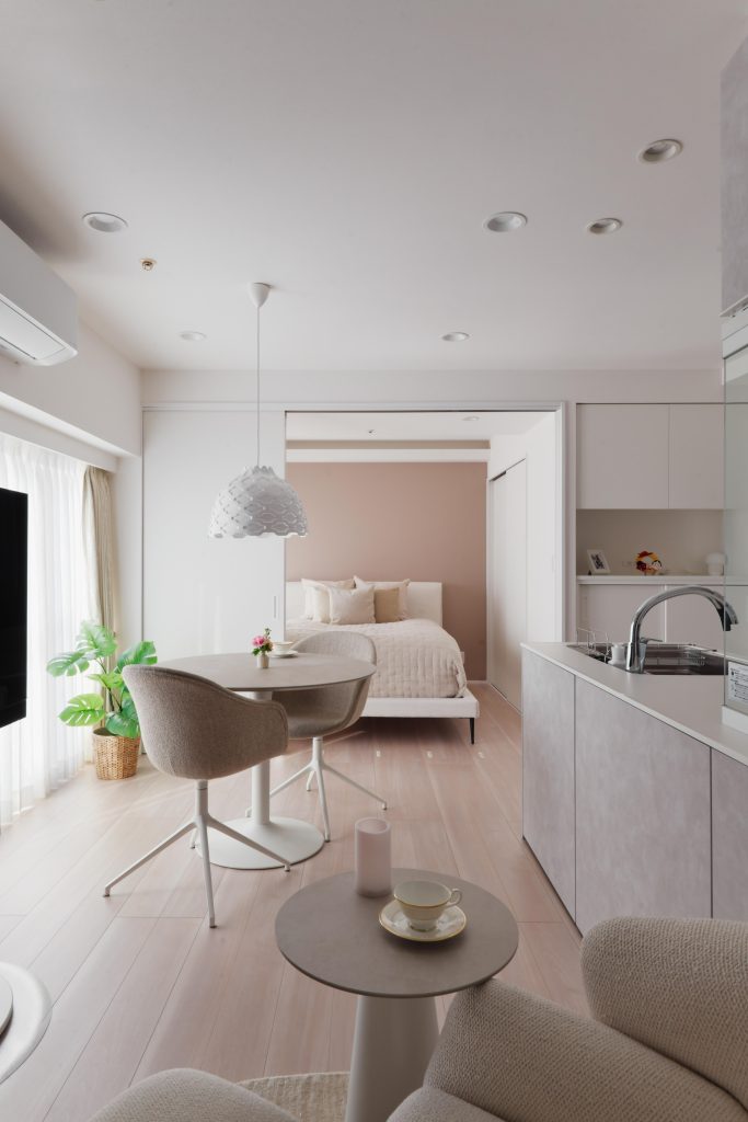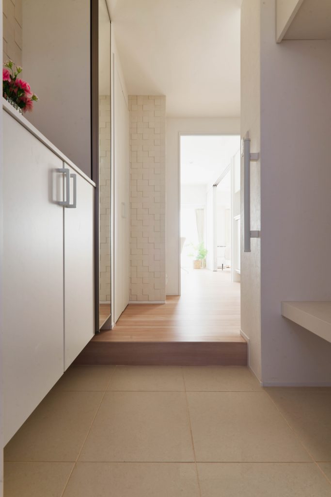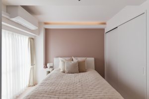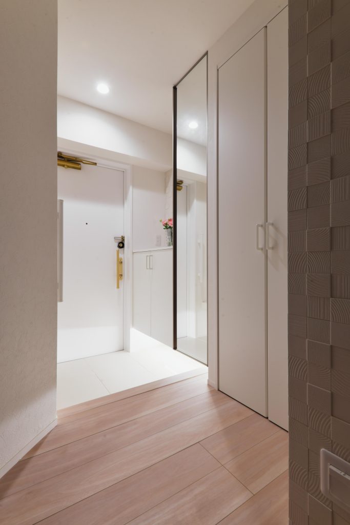 全体の色味はホワイト・グレー・ベージュ(グレージュ)で統一し、洗練された統一感のある空間に。各所にエコカラットのアクセントウォールを設け、大人の上質な雰囲気を演出しながらも、寝室のアクセントクロスで可愛らしさもプラスしました。