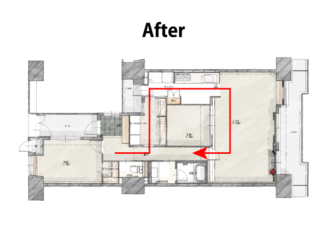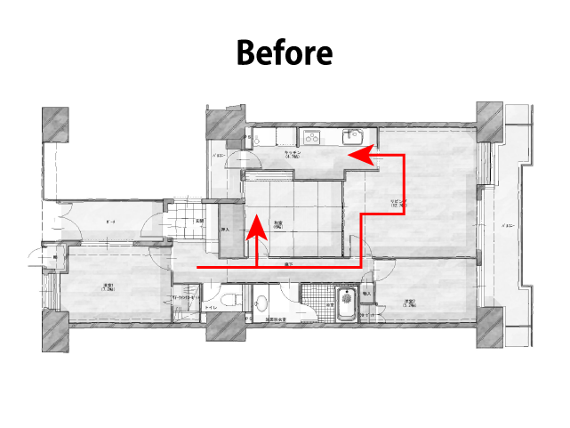 リフォーム前は、玄関からキッチンが遠く、回遊することができない間取りでした。